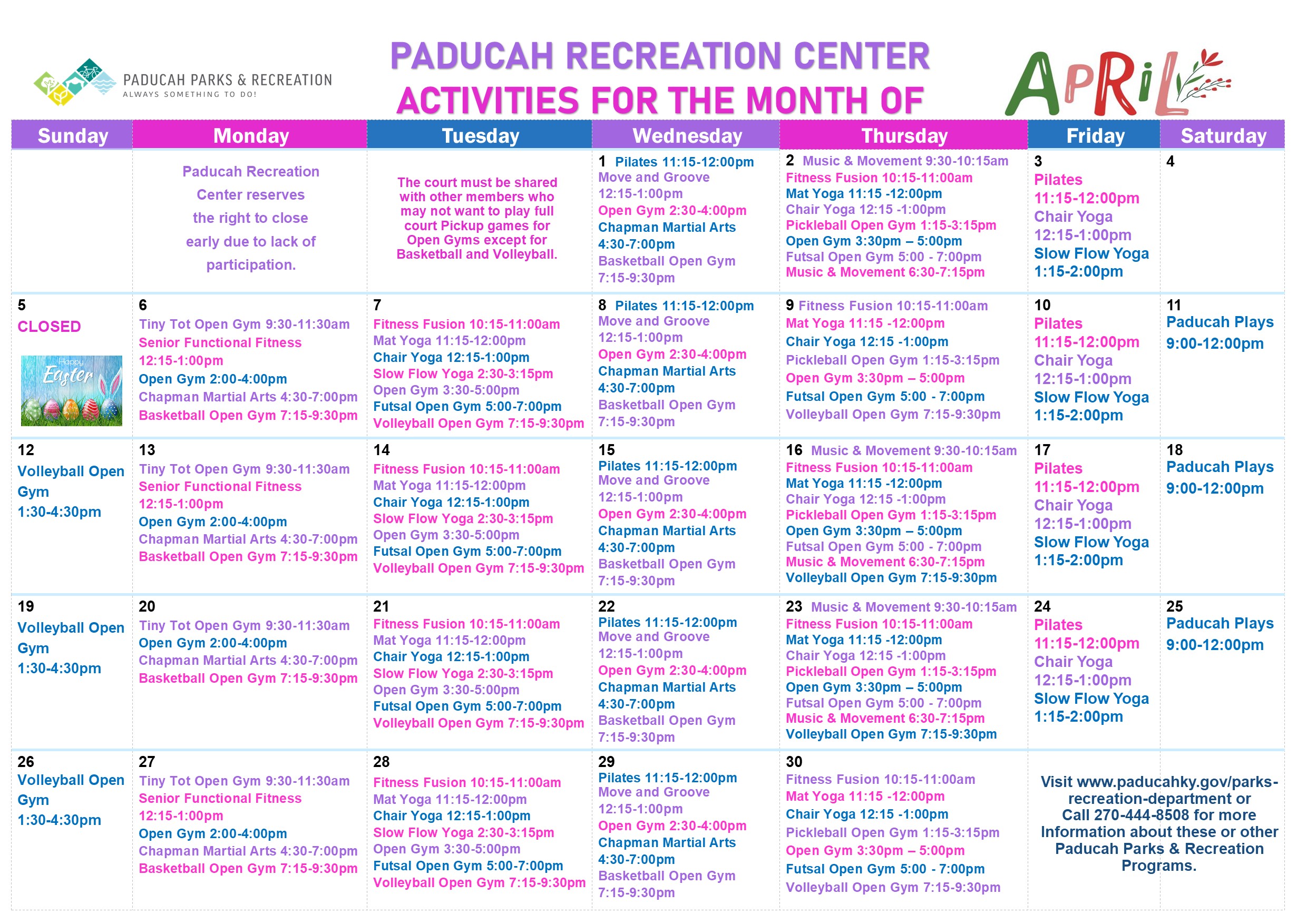 - Paducah parks & Recreation is not responsible for lost or stolen items.